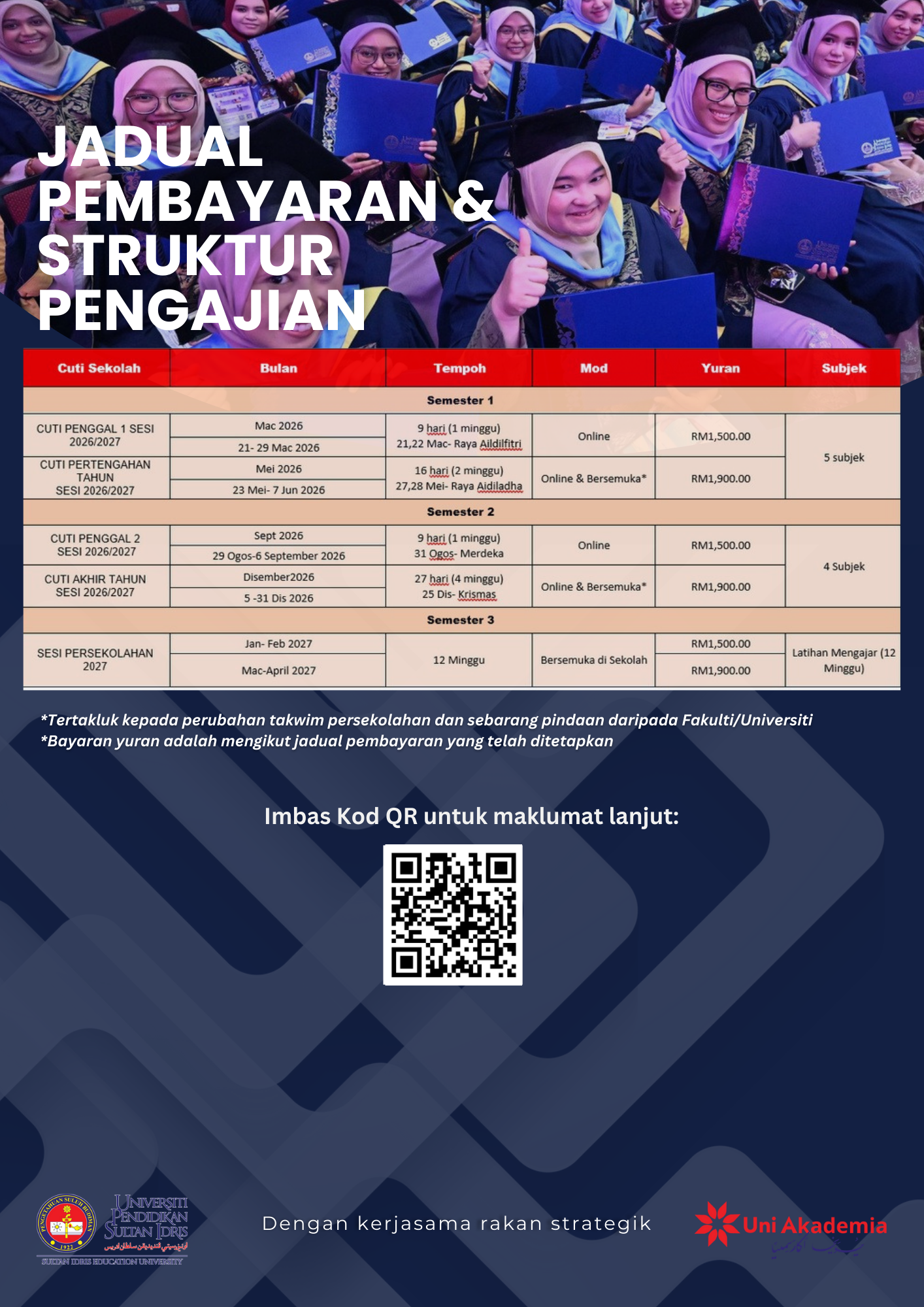 Yuran pengajian berjumlah RM10,200.00 untuk pengajian selama tiga semester. Bayaran yuran hendaklah dijelaskan secara penuh setiap semester mengikut struktur jadual bayaran yuran di bawah: